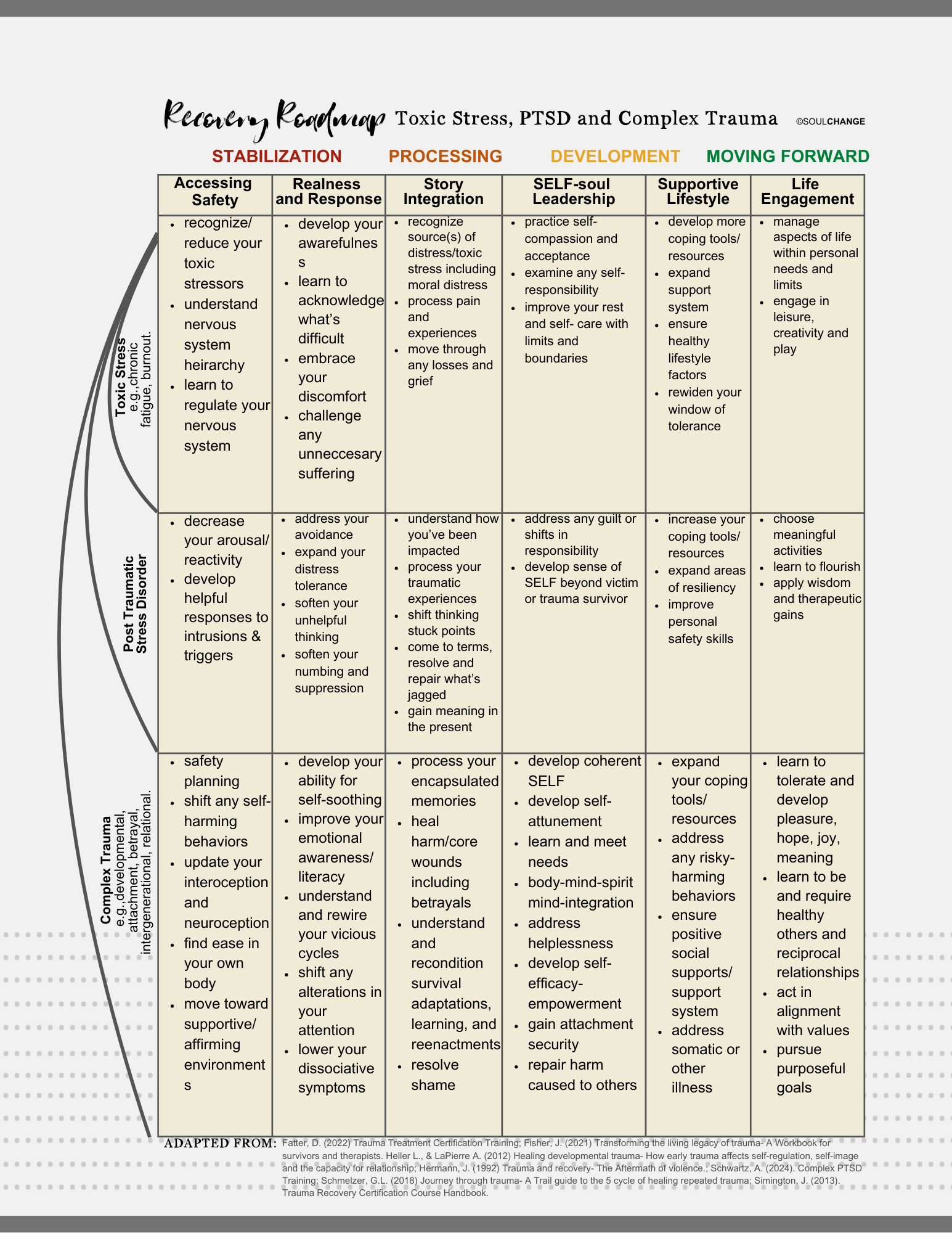The hopeful reasons, including the breakthroughs in our understanding of toxic stress and trauma and recovery approaches, result in a bit of recovery roadmap. Like any other roadmap, it lays out the various phases of recovery (stabilization, processing, development, and moving forward) and shows the basic recovery tasks for toxic stress, compared to post traumatic stress disorder, compared to complex trauma.